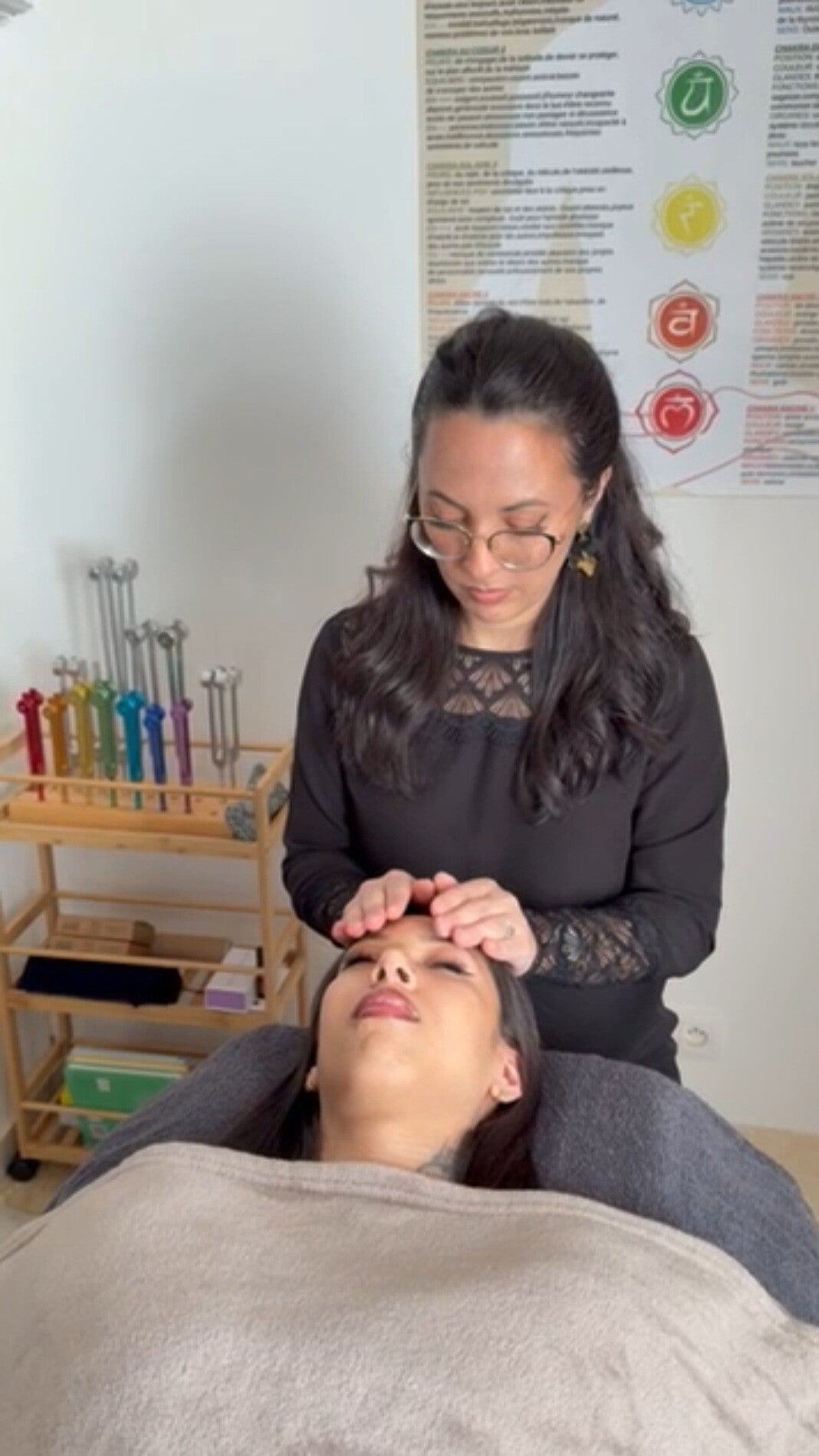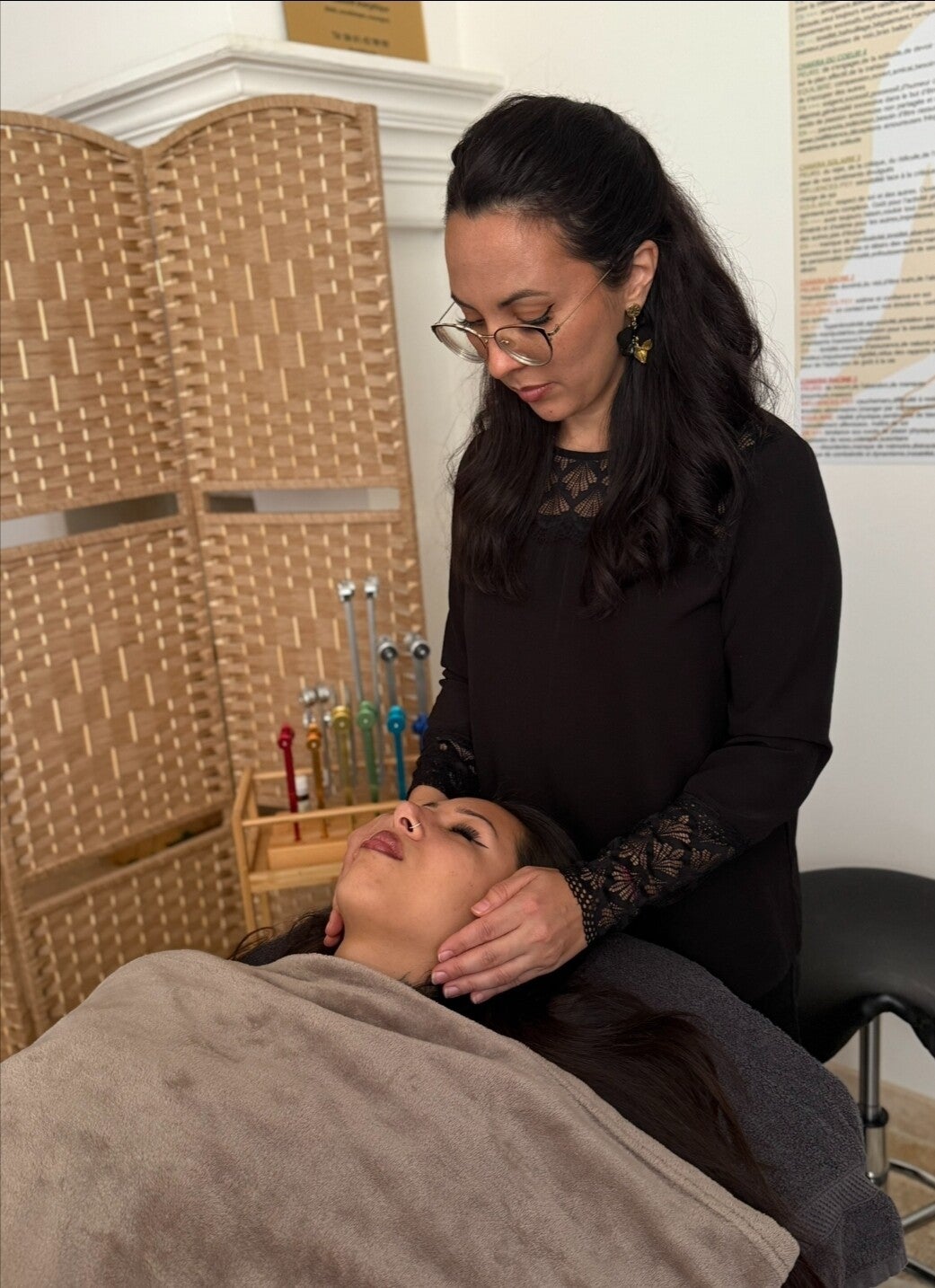 Vous pouvez être allongé(e) ou assis(e), l’important est d’être détendu(e). Il n’est pas nécessaire d’être en communication pendant le soin. Vous pouvez donc continuer vos activités si vous ne pouvez pas faire autrement !
